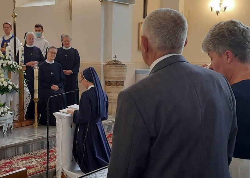 Wiele uczuć i emocji towarzyszyło mi w kolejnej godzinie. Z pewnością długo będę pamiętać wezwanie Matki Generalnej: „Niech przystąpi siostra, która pragnie złożyć profesję wieczystą” i moją odpowiedź: „Oto jestem, Panie, bo mnie wezwałeś”, słowa z okolicznościowej homilii Ks. Biskupa, modlitwę wszystkich zgromadzonych litanią do wszystkich świętych przed samym momentem mojej konsekracji, chwilę wypowiadania formuły ślubów i jej podpisania, modlitwę konsekracji, nałożenia obrączki. Oczywiście niezapomniana będzie dla mnie sama liturgia Eucharystii, w której uczestniczyłam już jako na wieki poślubiona oblubienica Tego, który składał największą ofiarę!