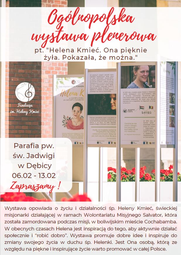 Warto tak żyć. Dlatego, by upamiętnić jej piękne życie i promować dobro, które czyniła, by nas inspirowało do zmiany naszego życia i większego zaangażowania w czynienie dobra, Fundacja im. Heleny Kmieć przygotowała wystawę plenerową pt. ”Helena Kmieć. Ona pięknie żyła. Pokazała, że można”. Wystawa będzie eksponowana przy kościele św. Jadwigi w Dębicy i można ją będzie obejrzeć w dniach od 06 do 13 lutego br.