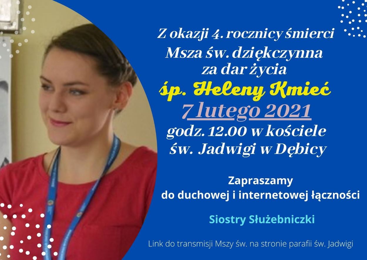 W niedzielę 7 lutego 2021 r., o godz. 12.00, w kościele parafialnym pw. Świętej Jadwigi w Dębicy, zostanie odprawiona Msza św. dziękczynna za dar życia Heleny Kmieć, które niespodziewanie zakończyła na ziemi boliwijskiej, 24 stycznia 2017 r., w czasie wypełniania misji, w ramach Wolontariatu Misyjnego Salvator, w naszej ochronce w Cochabambie.