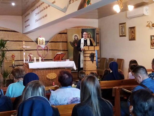 Ojciec Łukasz Baran, redemptorysta poprowadził duchowo dzień skupienia i służył posługą sakramentalną. W pierwszej konferencji przybliżył nam temat „Wierzę w Kościół – lud Boży uczestniczący w misji kapłańskiej, prorockiej, królewskiej”. Mówił o tym, że już sakrament Chrztu św. zobowiązuje nas do świadectwa życia zgodnego z Dekalogiem, do czynnego włączenia się w ewangelizację i misyjną działalność Kościoła w służbie innym ludziom, a więc w misję kapłańską, prorocką i królewską. Zachęcił nas do tego, byśmy panowali nad grzechem u siebie, w środowisku i byli sługami wobec bliźniego. Niech nie krępuje nas pokazanie tego, że chcę naśladować Chrystusa, że chcę być godną zwać się dzieckiem Boga, pragnę pracować nad uświęceniem bliźniego i na ile potrafię przekażę wiedzę o Bogu, nauce Jezusa, a ponadto będę walczyć ze złem.