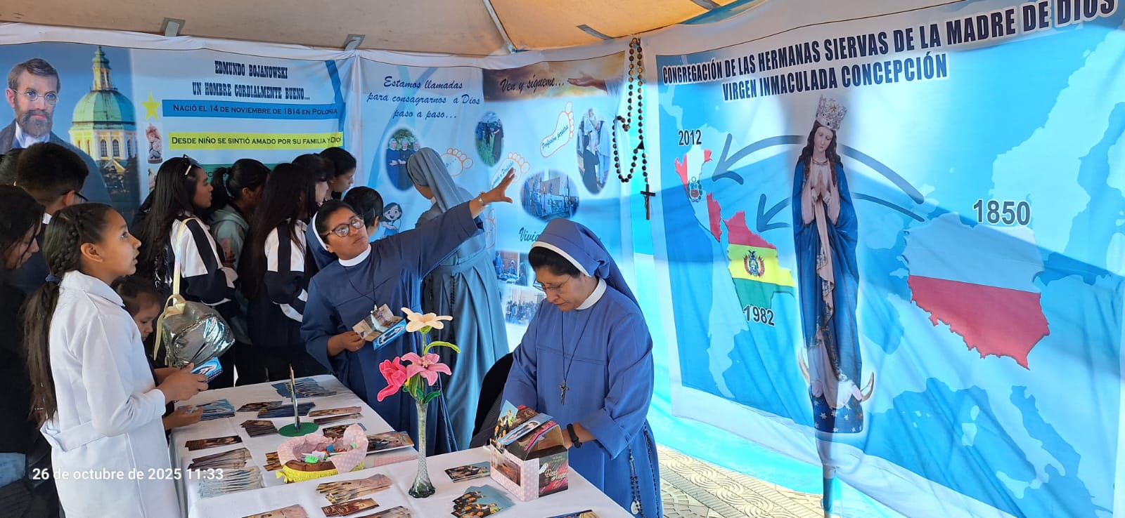 W niedzielę 6 października od godziny 9.00 do15.00 na placu Plaza de las Banderas w Cochabamba odbyło się Expo Carisma i Festiwal Misyjny. Było to wydarzenie, które miało na celu celebrację bogactwa charyzmatów i stylów życia, które Duch Święty inspiruje w Kościele, w atmosferze muzyki, tańca, świadectw i misyjnej radości. Wiele Zgromadzeń i Ruchów miało swoje stoiska przy których prezentowały swoją działalność, duchowość i charyzmat. My również wzięłyśmy udział w tym wydarzeniu. Cztery siostry: s. Miriam, Virginia, Carolain i Karolina opowiadały o naszym Założycielu, historii, charyzmacie, duchowości i formacji. Przygotowałyśmy również około 200 różańców, które można było otrzymać za udzielenie poprawnej odpowiedzi na wylosowane pytanie. Każdy też mógł zabrać ze sobą obrazki, zakładki i folderki oraz lizaki z myślą bł. Edmunda. Nasze stoisko odwiedziło mnóstwo osób, zwłaszcza młodych, które z uwagą i zainteresowaniem słuchały sióstr. Z ogromną radością losowali też pytania, aby otrzymać różaniec. Dla nas był to bardzo dobry dzień pełen wrażeń, dobrych spotkań i rozmów.