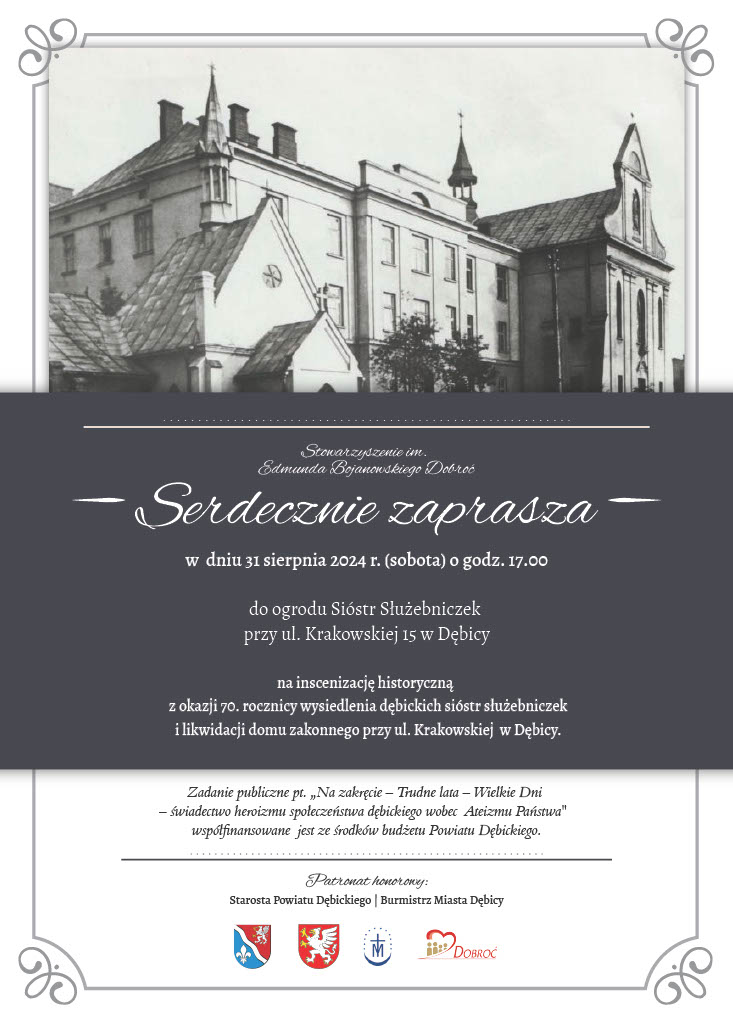Wspominając dzień 24 sierpnia 1954 roku i ogromne wsparcie mieszkańców Dębicy zapraszamy na inscenizację historyczną, która odbędzie się 31 sierpnia (sobota) o g. 17.00 w Ogrodach Sióstr Służebniczek przy ul. Krakowskiej 15.