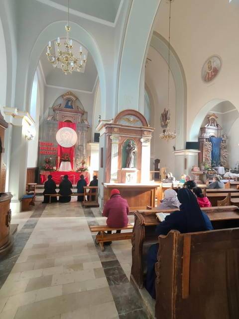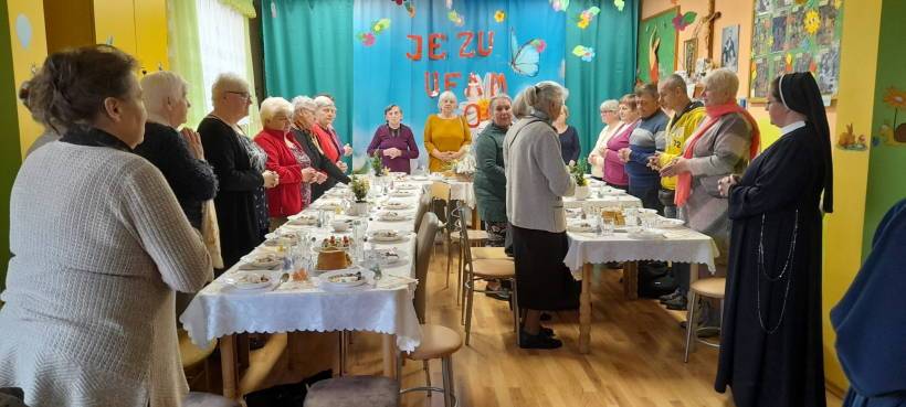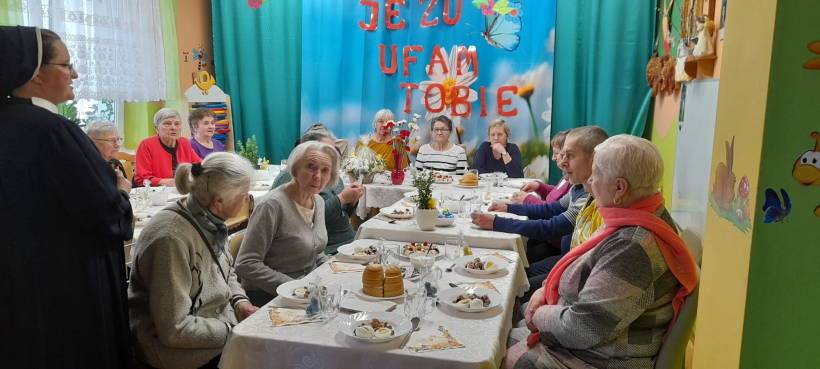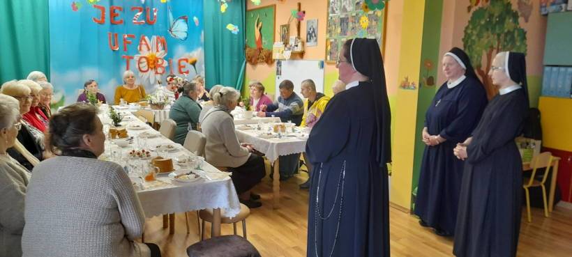 6 kwietnia, w I sobotę miesiąca i wigilię Niedzieli Miłosierdzia Bożego spotkaliśmy się w kaplicy Ochronki sióstr Służebniczek. Modlitwę rozpoczęliśmy nowenną i koronką do Miłosierdzia Bożego. Następnie siostry zaprosiły nas na wielkanocny poczęstunek i chociaż nie był to poranek wielkanocny, to i tak celebrowaliśmy go uroczyście. Siostra Justyna poprowadziła modlitwę, złożyła wszystkim życzenia, a także przeczytała życzenia od Matki Generalnej. Podziękowała także za pomoc współsiostrom i członkom Rodziny w przygotowaniu spotkania.