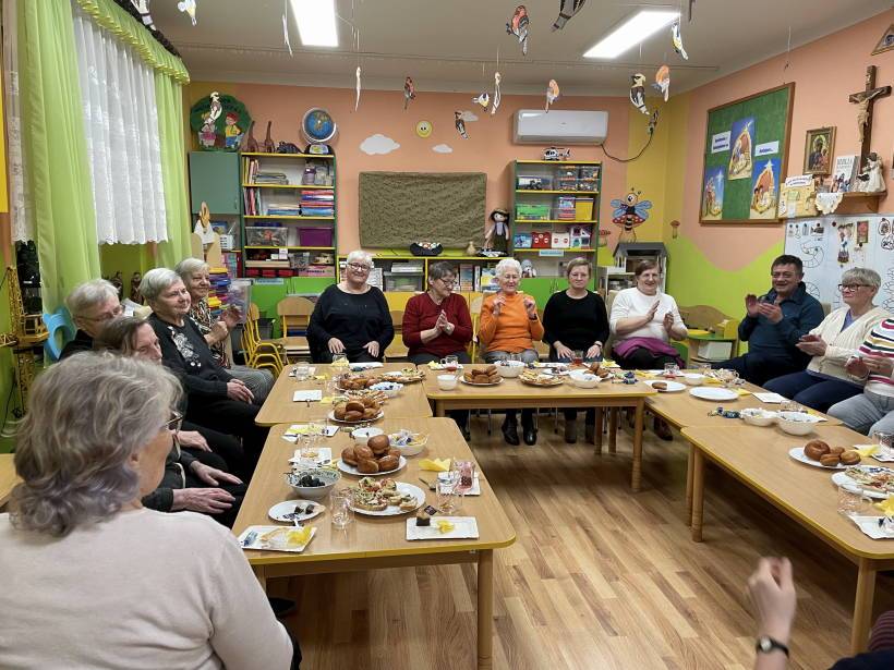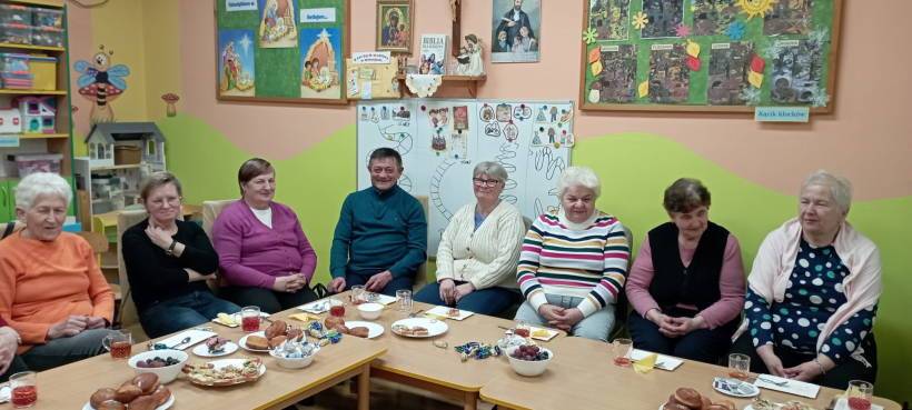 Dalsza część spotkania odbyła się w sali, gdzie podkreśliliśmy radosny czas, jakim jest karnawał. Po modlitwie przed poczęstunkiem zasiedliśmy do stołu, na którym królowały „przepyszne” pączki. W tym dniu uczciliśmy także imieniny s. Doroty, dziękując Bogu za jej powołanie, za pracę w parafii i wspieranie naszej grupy. Nie zapomnieliśmy też o drugiej Solenizantce – p. Dorotce z naszej Rodziny Edmundowej. Radością jest dla nas to, że Rodzina bł. Edmunda w Rudniku szybko się powiększa. Pani Krystyna i Pan Kazimierz to kolejni nowi kandydaci, których przedstawiła nam s. Justyna.