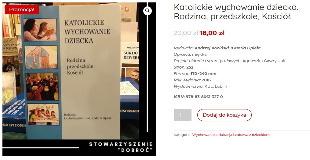 Wychowanie małego dziecka jest bardzo ważnym zadaniem i obowiązkiem rodziców. W tej jakże niełatwej misji chce ich wspierać przedszkole i Kościół kierując się zasadą pomocniczości. Żyjemy w świecie, który lansuje różne modele wychowania. Wszystkim, którzy w obliczu współczesnych wyzwań edukacyjnych poszukują wsparcia w wychowaniu małego dziecka w oparciu o chrześcijański system wartości i zgodnie z nauczaniem Kościoła katolickiego polecamy książkę pt. „Katolickie wychowanie dziecka. Rodzina – przedszkole – Kościół” pod red. ks. Andrzeja Kicińskiego i s. Marii Opiela.