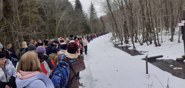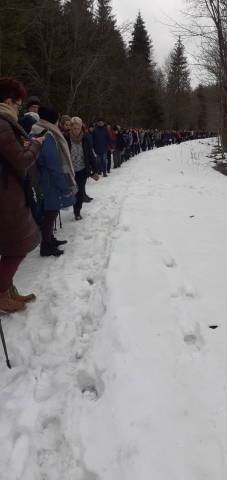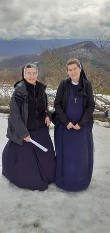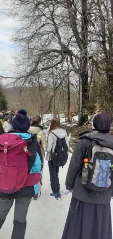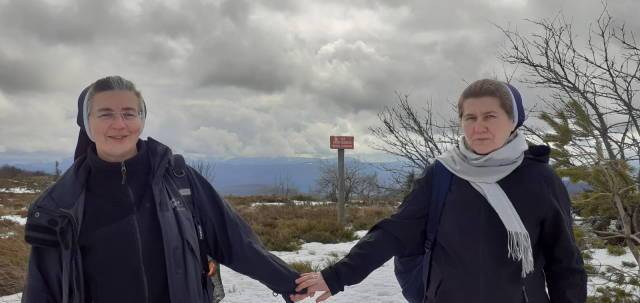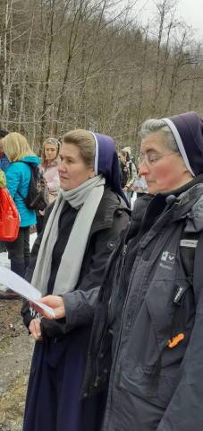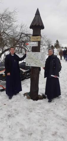 My też podjęłyśmy te wyzwania, krocząc drogą krzyżową i brnąc w śniegu, bo niestety nasze obuwie nie spełniło standardów wędrówek górskich. Jednak to nam nie przeszkadzało w dźwiganiu intencji naszego Zgromadzenia, Ojczyzny, świata, naszych wspólnot, ludzi młodych, rodzin i tych wszystkich, którym na co dzień posługujemy. Będąc na szczycie platformy widokowej i miejsca naszej granicy z Ukrainą pamiętałyśmy o udręczonym narodzie ukraińskim i o modlitwie o pokój.