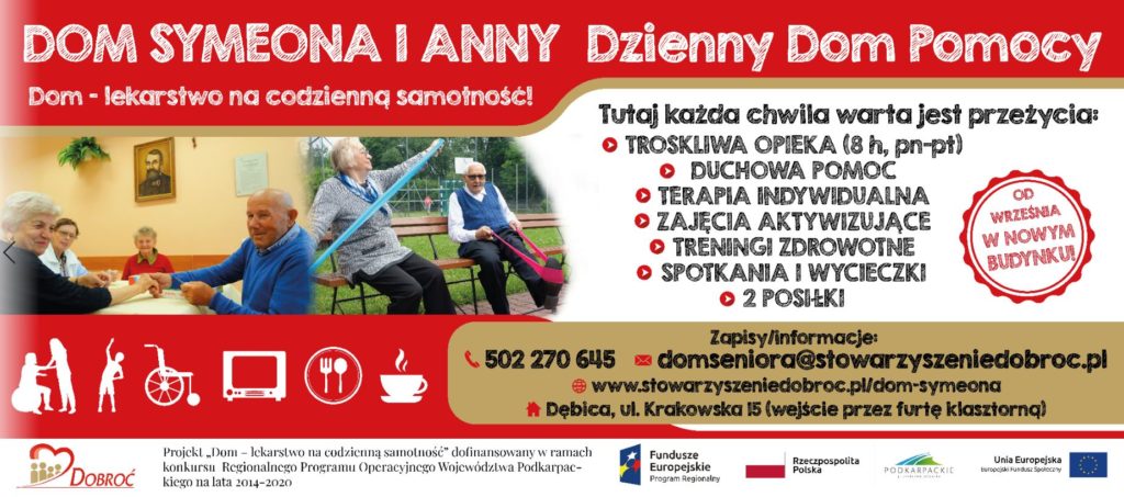Już od 1 września 2020 r. „Dom Symeona i Anny” prowadzony przez nasze Stowarzyszenie „Dobroć” rozpocznie swoją działalność realizując projekt „Dom lekarstwo na codzienną samotność”. Projekt dofinansowany jest w ramach konkursu Regionalnego Programu Operacyjnego Województwa Podkarpackiego na lata 2014-2020 a jego głównym celem jest dzienna, kompleksowa pomoc osobom potrzebującym wsparcia w codziennym funkcjonowaniu ze względu na wiek lub niepełnosprawność.