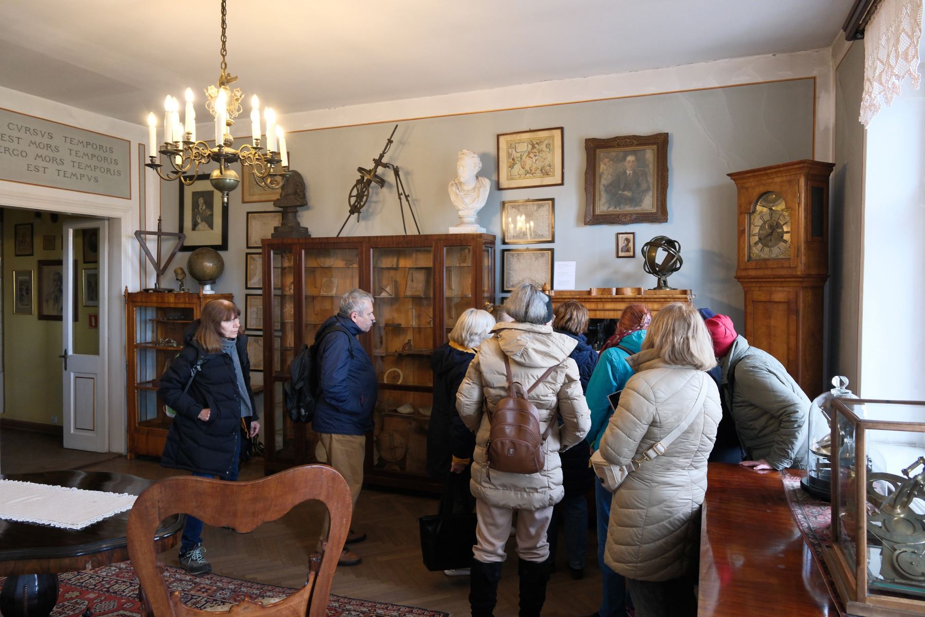 Następnym etapem naszej wyprawy było zwiedzanie Muzeum Zegarów. Muzeum mieści się w dawnym domu PP Przypkowskich i zawiera jeden z największych zbiorów tego typu na świecie. Prekursorem zbiorów był Feliks Przypkowski lekarz i astronom. Jego pasję kontynuował syn Tadeusz, który znacznie wzbogacił kolekcję. A obecnie funkcję dyrektora muzeum pełni wnuk pana Feliksa. Oprócz imponującej kolekcji zegarów pochodzących z całej Europy obejrzeliśmy wyposażenie mieszkania PP Przypkowskich, bogaty księgozbiór, obrazy, meble, porcelanę. No i przepiękny kurdyban, którym wyłożone są ściany jednego z pokoi muzeum. Do muzeum należy też ogród, gdzie prezentowane są zegary słoneczne.