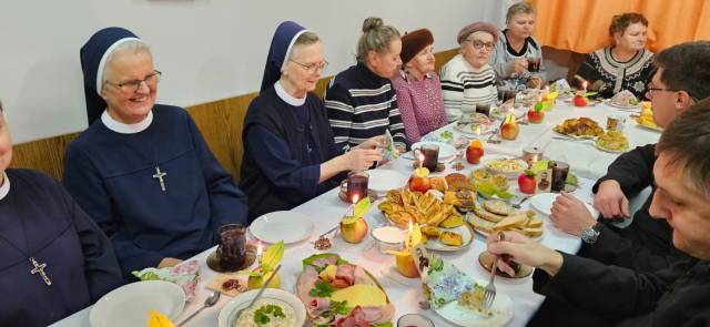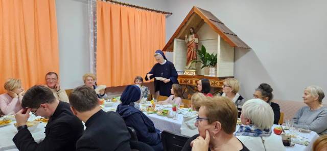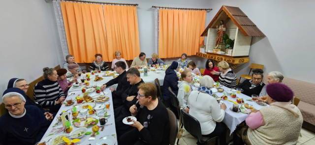 Po duchowej uczcie w kościele przeszliśmy do sali parafialnej – tam była agapa przygotowana przez członkinie grupy przy współpracy z siostrami. Wspólne spotkanie ubogacił śpiew pieśni ku czci bł. Edmunda i piosenek oazowych oraz świadectwa o tym, jak w naszych czasach bł. Edmund pomaga w różnych i trudnych sytuacjach życia.