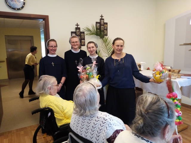 W Niedzielę Palmową po raz kolejny udałyśmy się do Domu Pomocy Społecznej „U Aniołów” w Jeżowem. Razem z podopiecznymi uczestniczyłyśmy we Mszy świętej, podczas której ksiądz poświęcił nasze palmy. Po Mszy świętej wspólnie odśpiewaliśmy Gorzkie Żale. Tym razem radość spotkania trwała dłużej. Służąc pomocą, zaprowadziłyśmy mieszkańców domu na obiad, który dzięki gościnności Sióstr mogłyśmy razem z nimi spożyć. Nie zabrakło również świątecznych życzeń, a jako świąteczny podarunek podopieczni domu dostali od nas babkę wielkanocną oraz pisanki zrobione przez naszych przedszkolaków.
