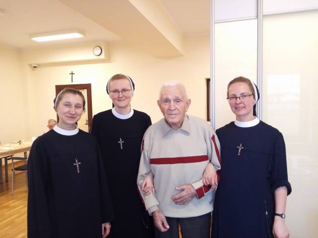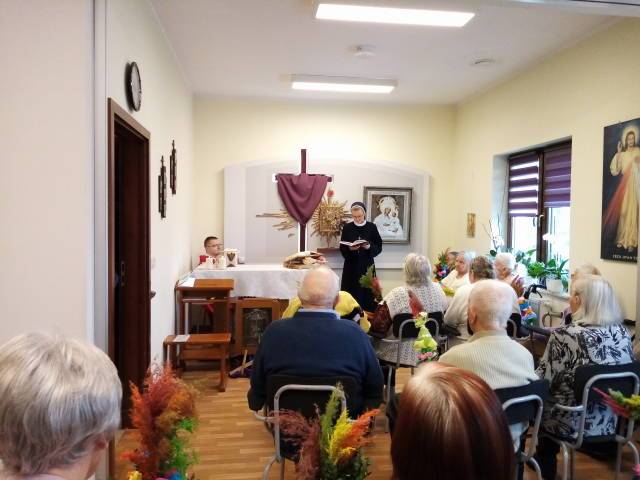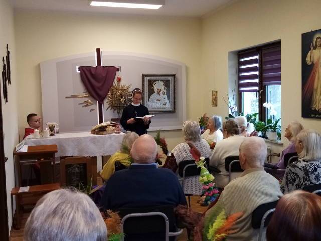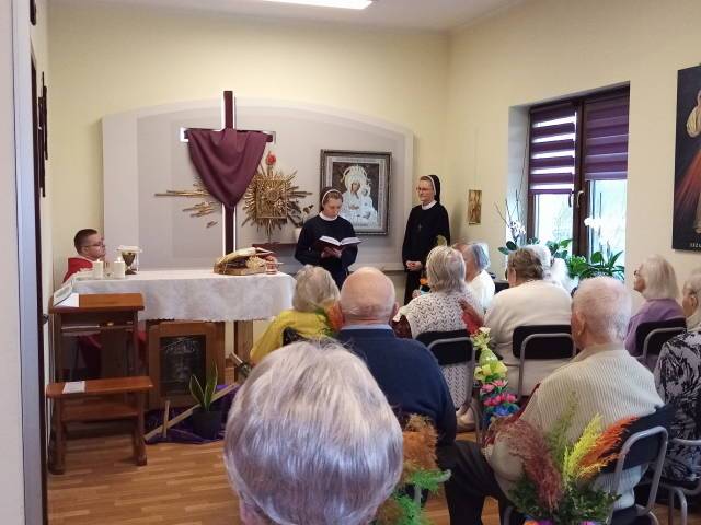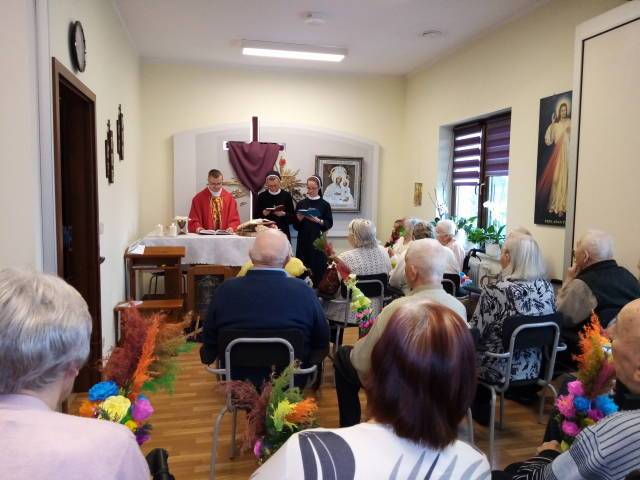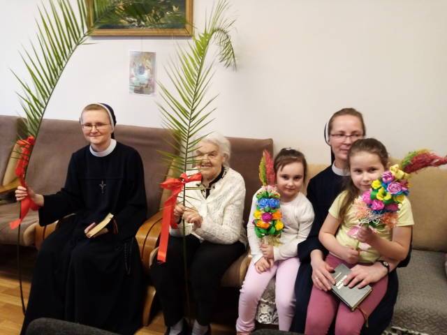 W Niedzielę Palmową po raz kolejny udałyśmy się do Domu Pomocy Społecznej „U Aniołów” w Jeżowem. Razem z podopiecznymi uczestniczyłyśmy we Mszy świętej, podczas której ksiądz poświęcił nasze palmy. Po Mszy świętej wspólnie odśpiewaliśmy Gorzkie Żale. Tym razem radość spotkania trwała dłużej. Służąc pomocą, zaprowadziłyśmy mieszkańców domu na obiad, który dzięki gościnności Sióstr mogłyśmy razem z nimi spożyć. Nie zabrakło również świątecznych życzeń, a jako świąteczny podarunek podopieczni domu dostali od nas babkę wielkanocną oraz pisanki zrobione przez naszych przedszkolaków.