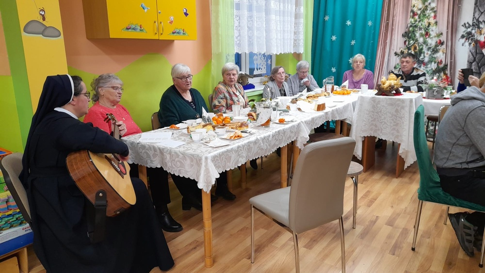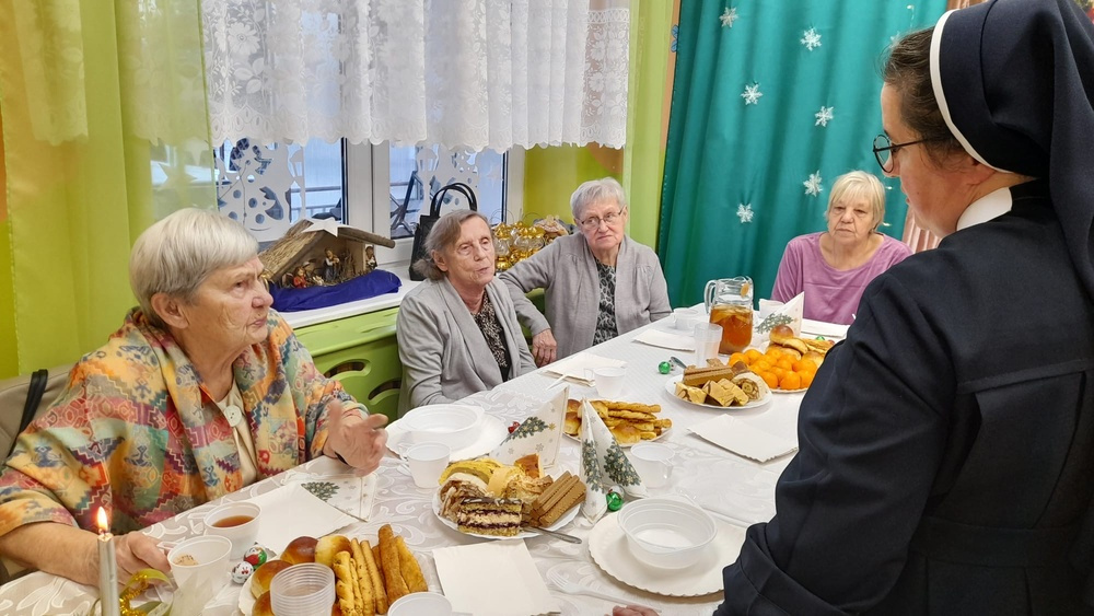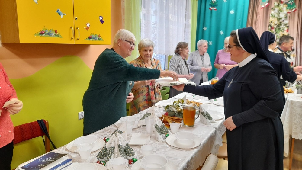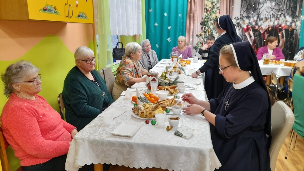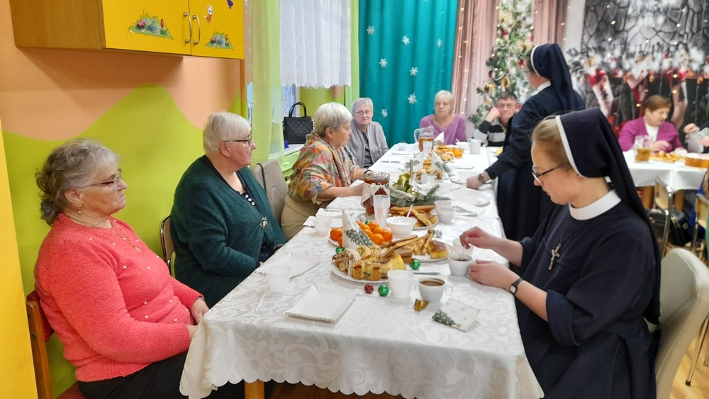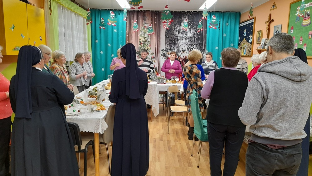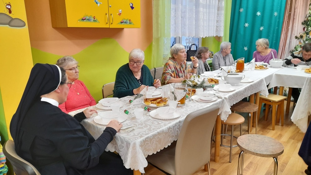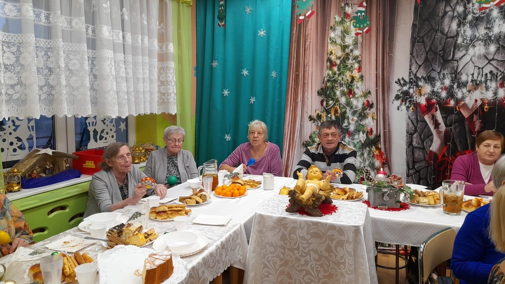 Po modlitwie udaliśmy się do świątecznie ustrojonej sali. Tu dzieliliśmy się opłatkiem, składając sobie noworoczne życzenia. Były wzruszenia z łezką w oku. Stoły były zastawione potrawami świątecznymi: barszcz z uszkami, pierogi, kapuśniaki i ciasta. To wszystko przynieśliśmy w darze od siebie. Wieczerza przerywana była kolędami, które na gitarze grała s. Justyna, co dodatkowo zachęcało wszystkich do śpiewu. Na koniec spotkania złożyliśmy też ofiarę pieniężną na Dom Dziecka w Boliwii i już czekamy na kolejne spotkanie, które odbędzie się 4 lutego.