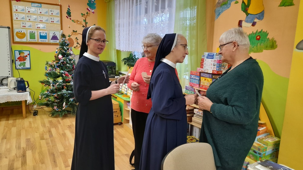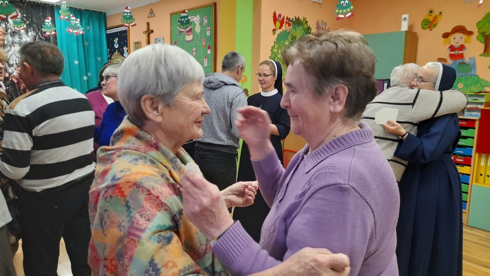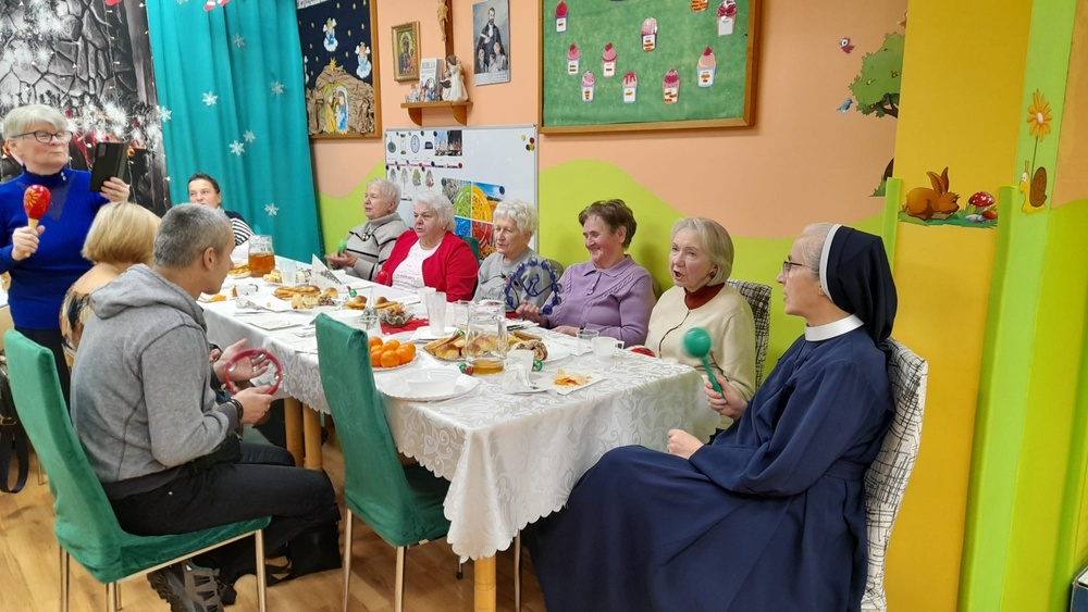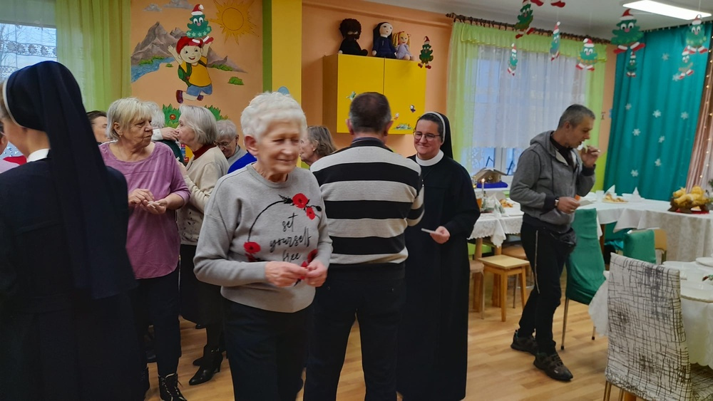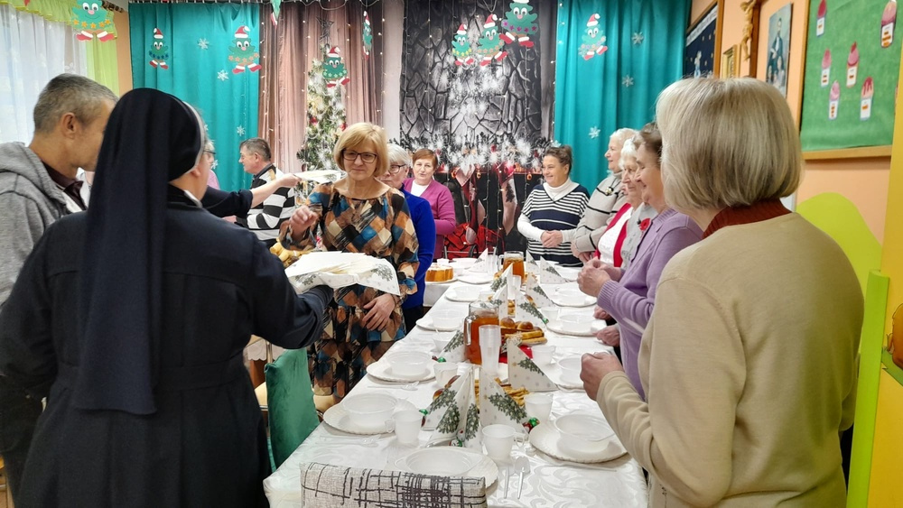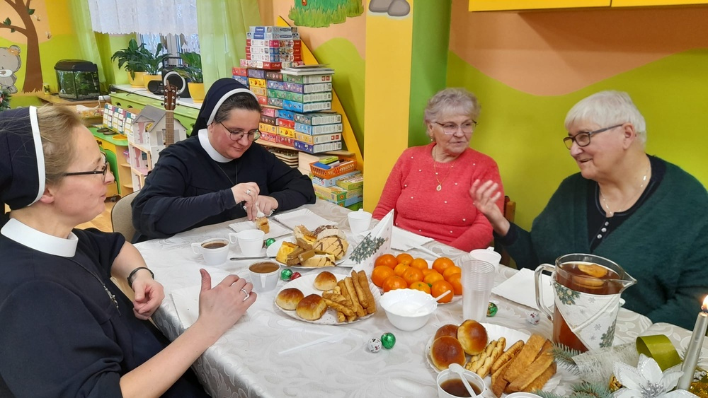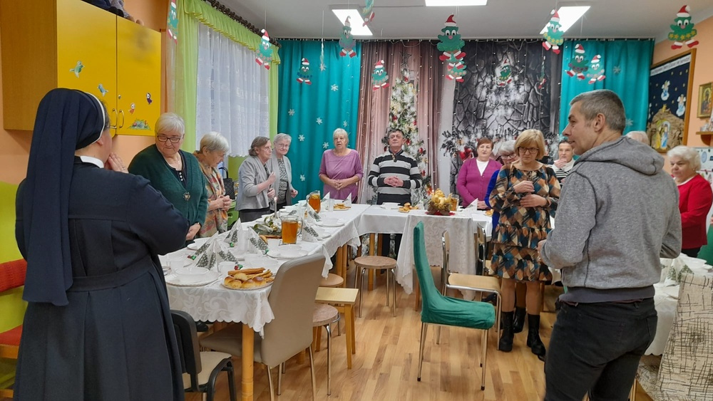 Po modlitwie udaliśmy się do świątecznie ustrojonej sali. Tu dzieliliśmy się opłatkiem, składając sobie noworoczne życzenia. Były wzruszenia z łezką w oku. Stoły były zastawione potrawami świątecznymi: barszcz z uszkami, pierogi, kapuśniaki i ciasta. To wszystko przynieśliśmy w darze od siebie. Wieczerza przerywana była kolędami, które na gitarze grała s. Justyna, co dodatkowo zachęcało wszystkich do śpiewu. Na koniec spotkania złożyliśmy też ofiarę pieniężną na Dom Dziecka w Boliwii i już czekamy na kolejne spotkanie, które odbędzie się 4 lutego.