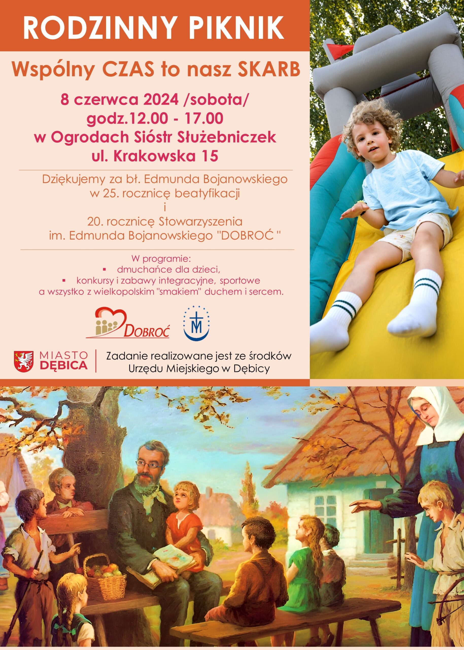 Dziękując za 25 lat od beatyfikacji Edmunda Bojanowskiego serdecznie zapraszamy na Rodzinny Piknik pod hasłem „Wspólny CZAS to nasz SKARB”, który odbędzie się 8 czerwca (sobota) 2024 r. w godzinach 12.00 – 17.00 w Ogrodach Sióstr Służebniczek przy ul. Krakowskiej 15 w Dębicy.